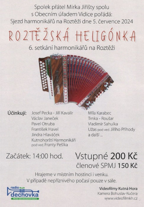 Spolek přátel Mirka Jiřišty ve spolupráci s OÚ Vidice Vás zve na tradiční Roztěžskou Heligónku do Lázní v Roztěži.